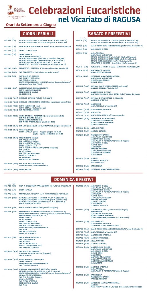 Orari delle Celebrazioni Eucaristiche, nel Vicariato di Ragusa.