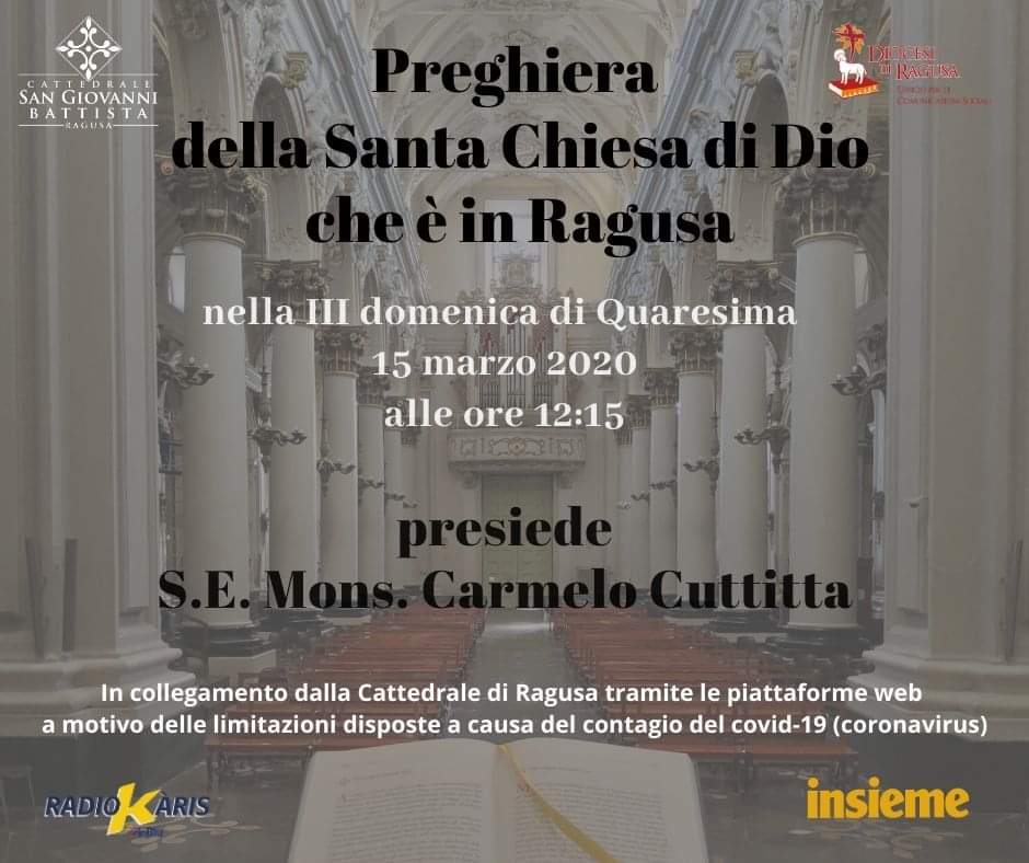 E la Diocesi ha subito attivato tutti gli strumenti di comunicazione e le piattaforme web. Domenica prossima, 15 marzo, alle 12.15, il vescovo monsignor Carmelo Cuttitta presiederà nella cattedrale un momento di preghiera per affidare alla protezione del Signore la Chiesa e l’umanità in questo tempo di pericolo per la salute pubblica. Tutta la Chiesa diocesana si stringerà attorno al suo pastore per elevare a Dio una insistente e accorata supplica. I fedeli potranno unirsi a questo momento di preghiera attraverso i siti e le piattaforme web già attive e, in particolare,www.cattedraletv.it; le pagine Facebook di Diocesi di Ragusa, Insieme Ragusa, Radio Karis, Cattedrale San Giovanni Battista Ragusa; Radio Karis inBlu (FM 87.8 e 99.3 e in streaming su www.radiokaris.it; il canale Youtube di Radio Karis Ragusa