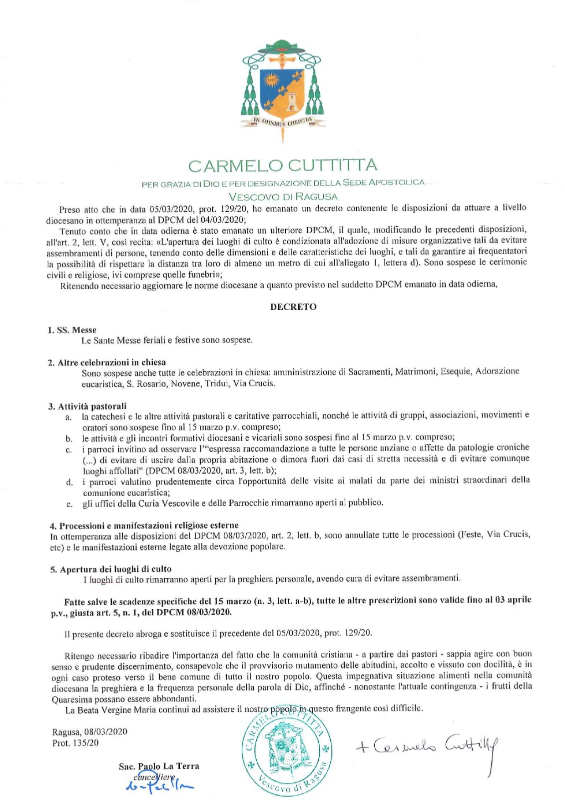 Il vescovo di Ragusa, monsignor Carmelo Cuttitta, ha integrato il decreto dello scorso 5 marzo con le nuove disposizioni indicate dal Consiglio dei Ministri. In particolare, sono sospese anche nella Diocesi di Ragusa tutte le Sante Messe festive e feriali e tutte le celebrazioni in chiesa: amministrazione di Sacramenti, Matrimoni, Esequie, Adorazione eucaristica, Santo Rosario, Novene, Tridui, Vie Crucis.